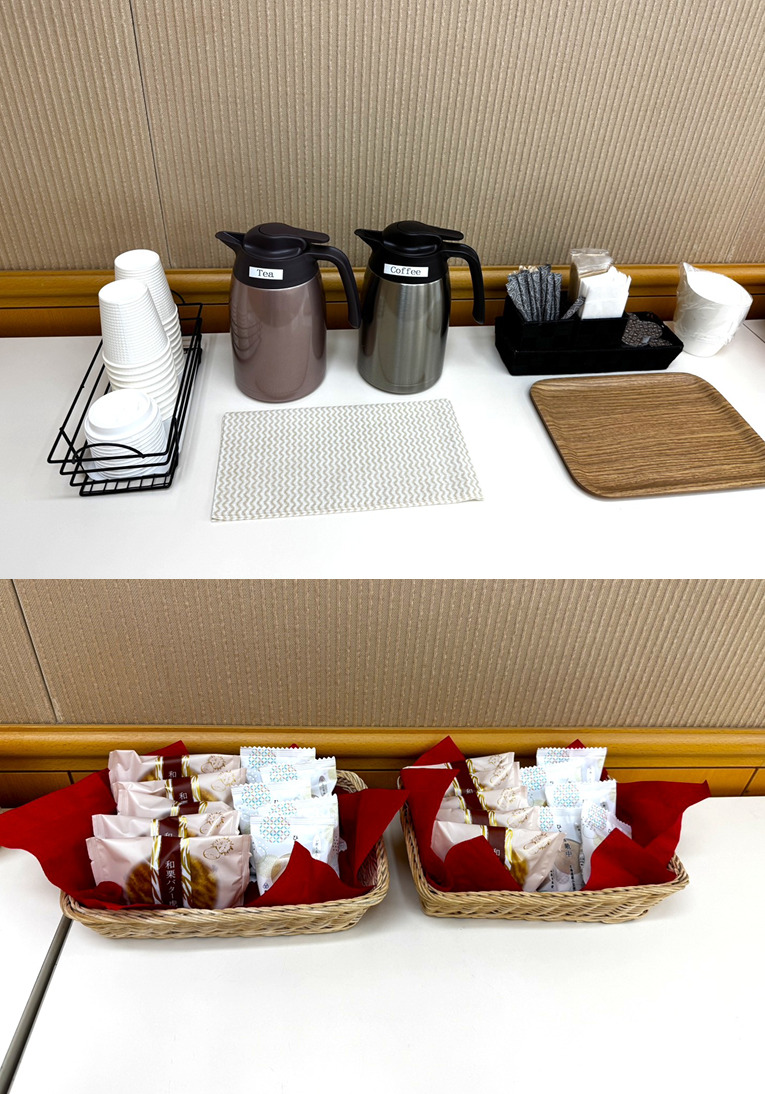 今回控室には、コーヒー・紅茶とお菓子をご提供させていただきました。控室へのケータリングサービスでは、コーヒーの納品から回収まで我々スタッフで行いますので、ご安心ください。