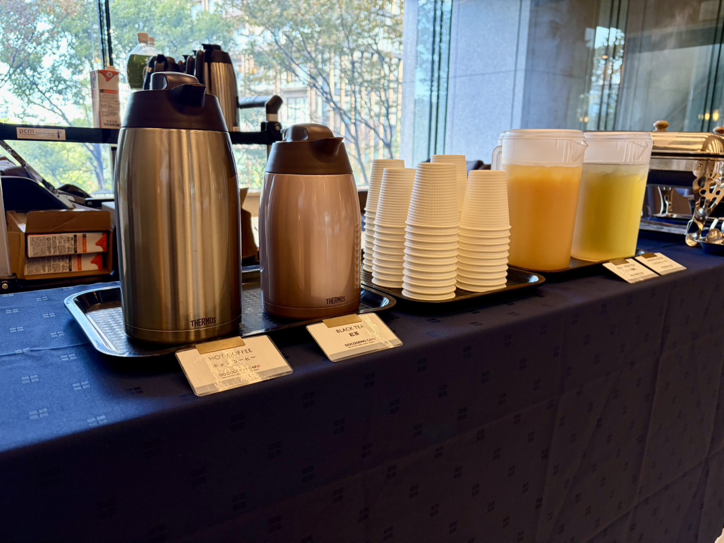 ドリンクは、「コーヒー/紅茶/オレンジジュース/緑茶/水」をご用意。提供はスタッフがドリンクをお聞きし、注いでご提供させていただきました。