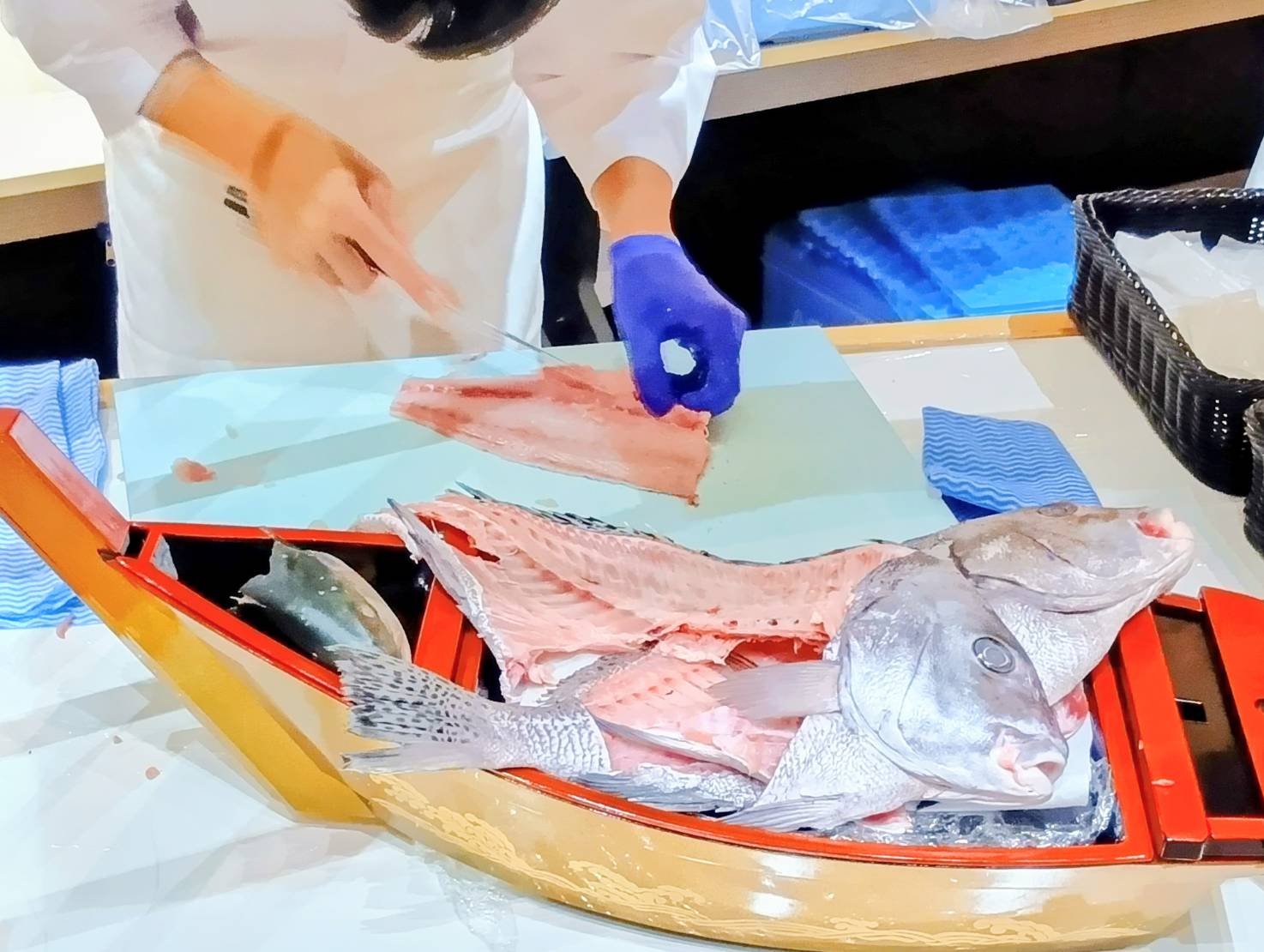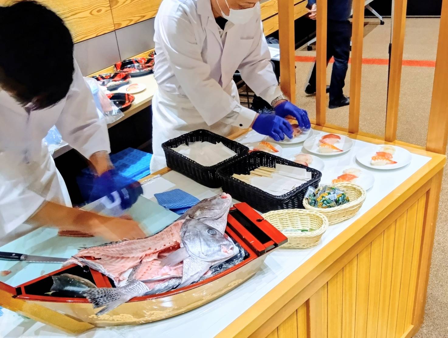 板前が目の前で魚を捌き、お寿司を握りました。