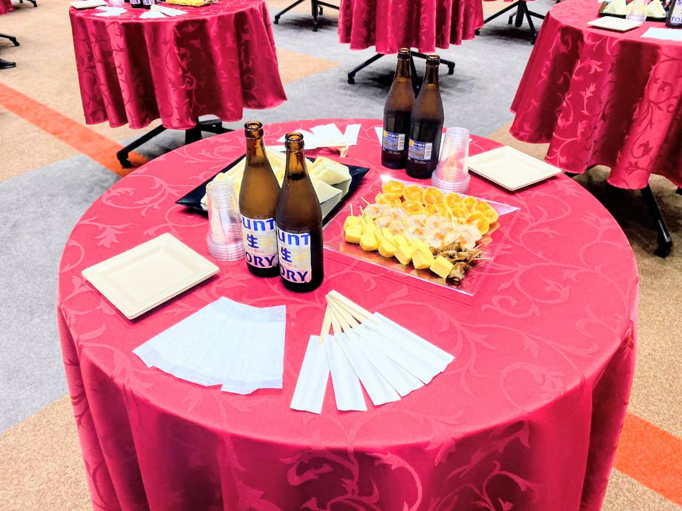 先ずは、乾杯で人混みになるのを避けるよう円卓にも乾杯用ビール、フィンガーフードをご用意します。
