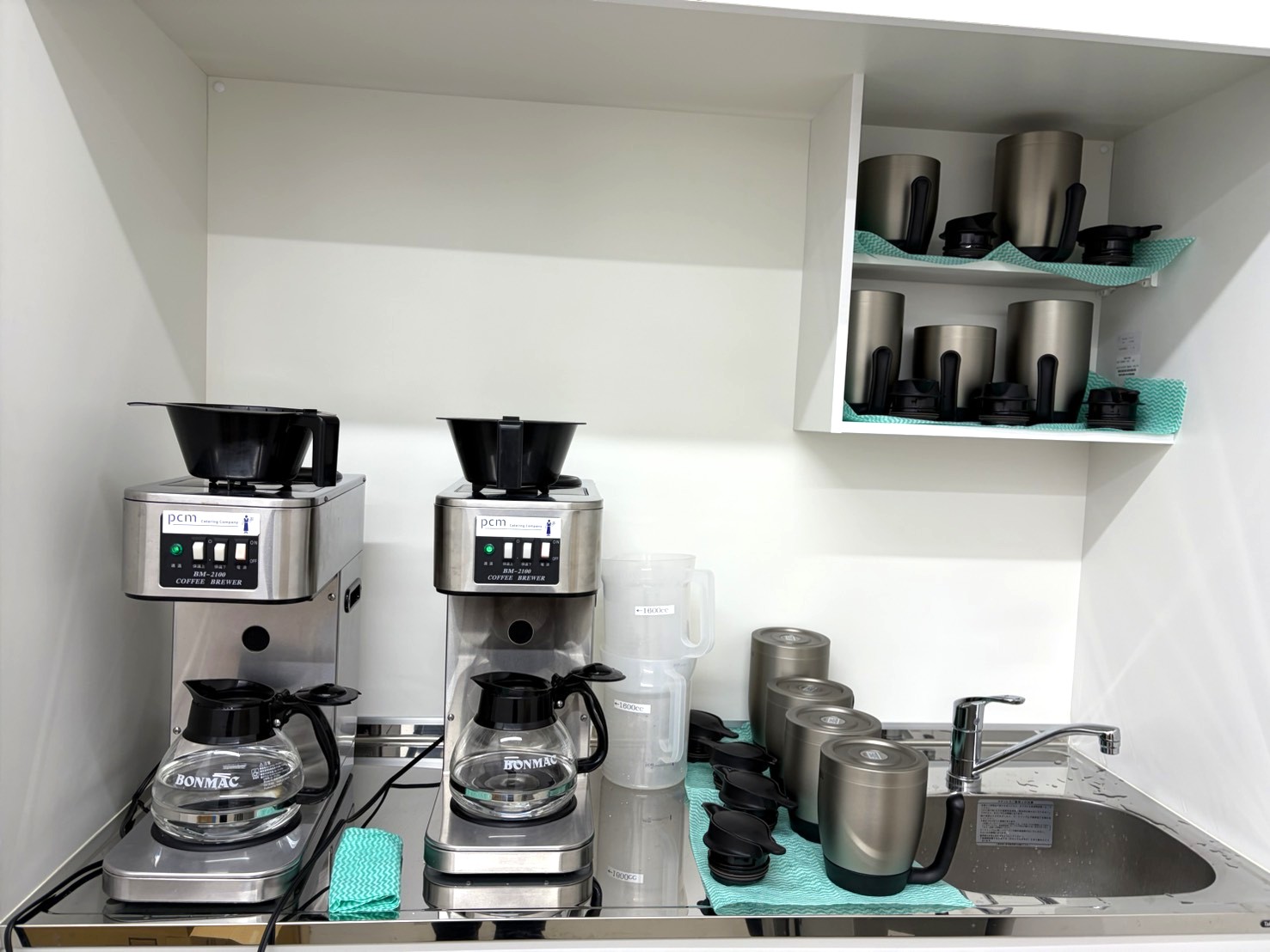 各諸室へのコーヒーサービスとして、コーヒーメーカーとコーヒーポットをご用意させていただきました。