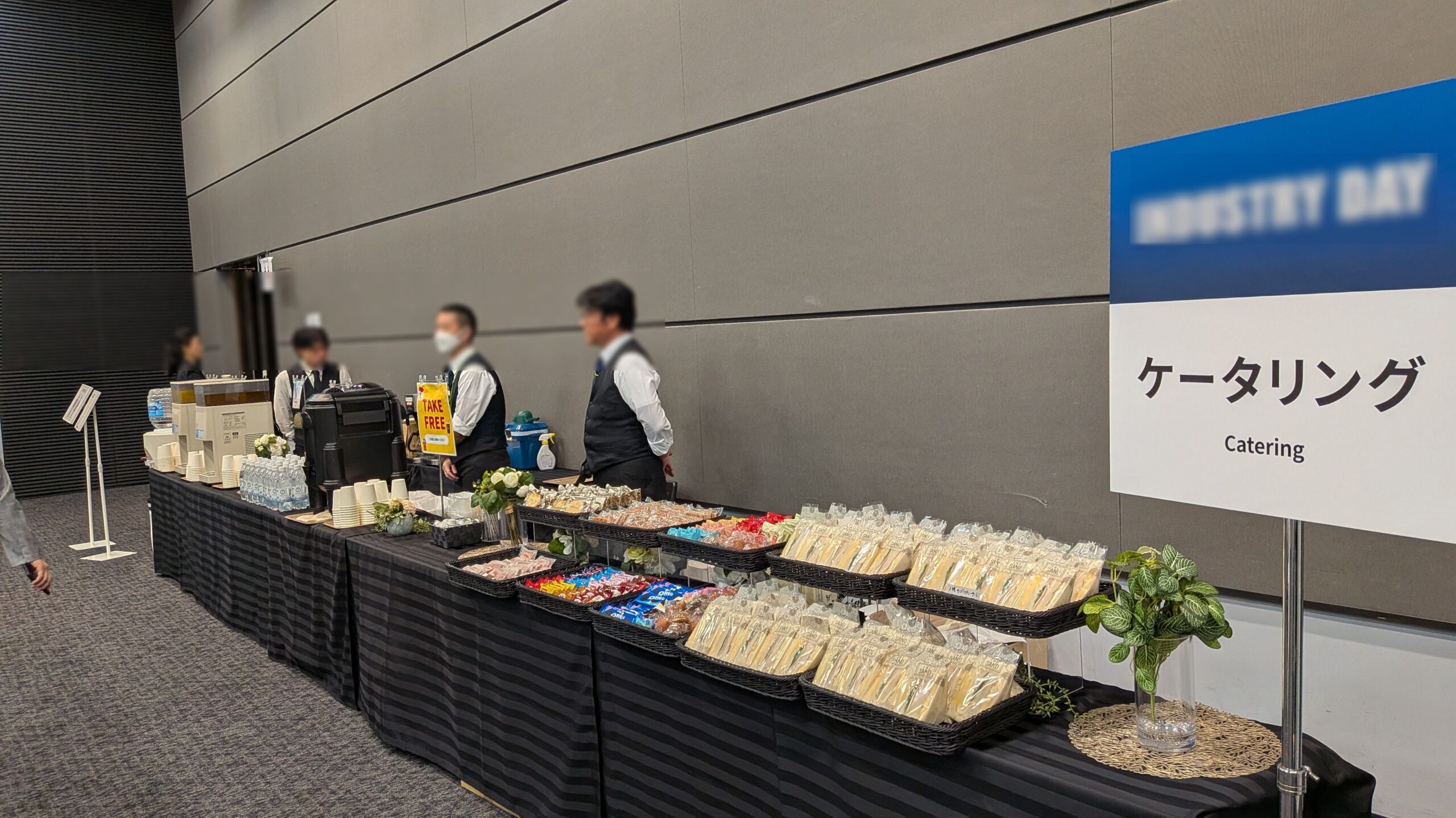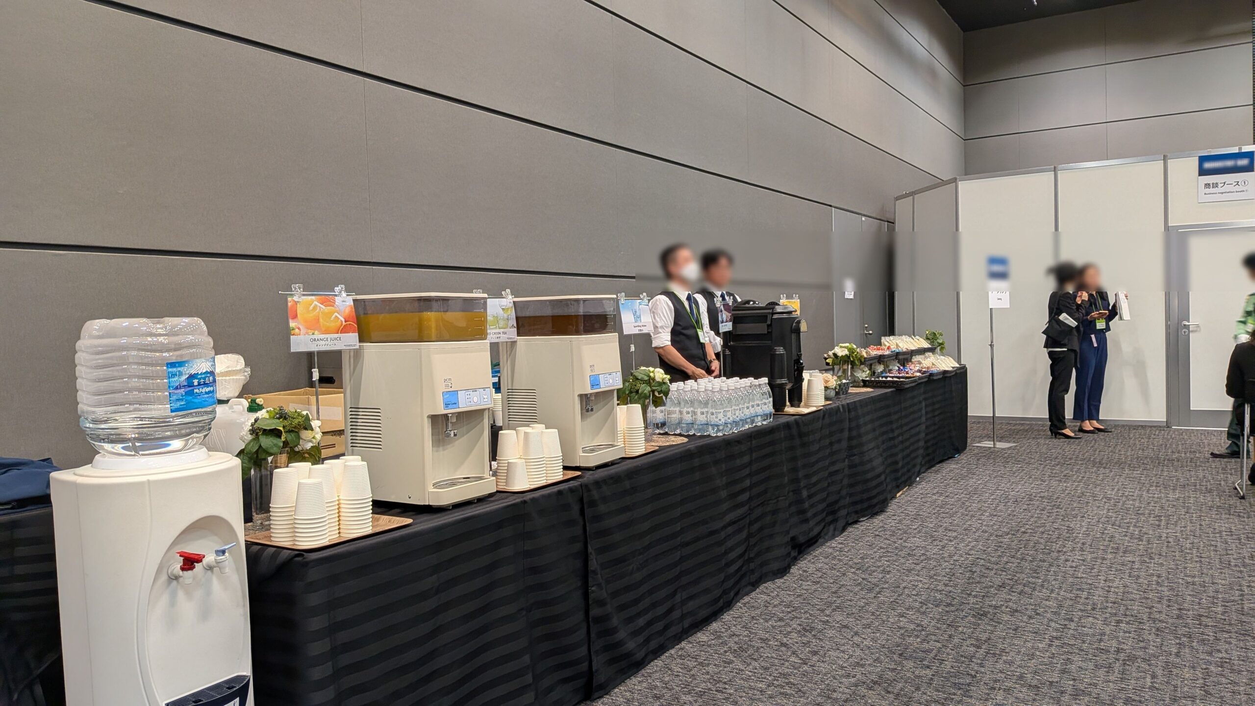 会場内にケータリングコーナーを設けてドリンクと軽食を参加者の方に振舞いました。