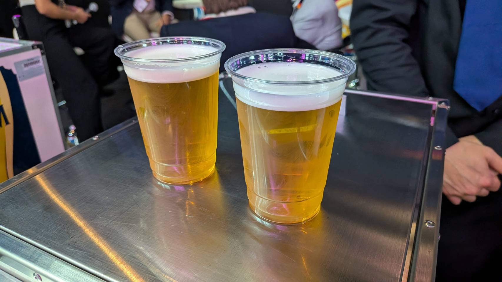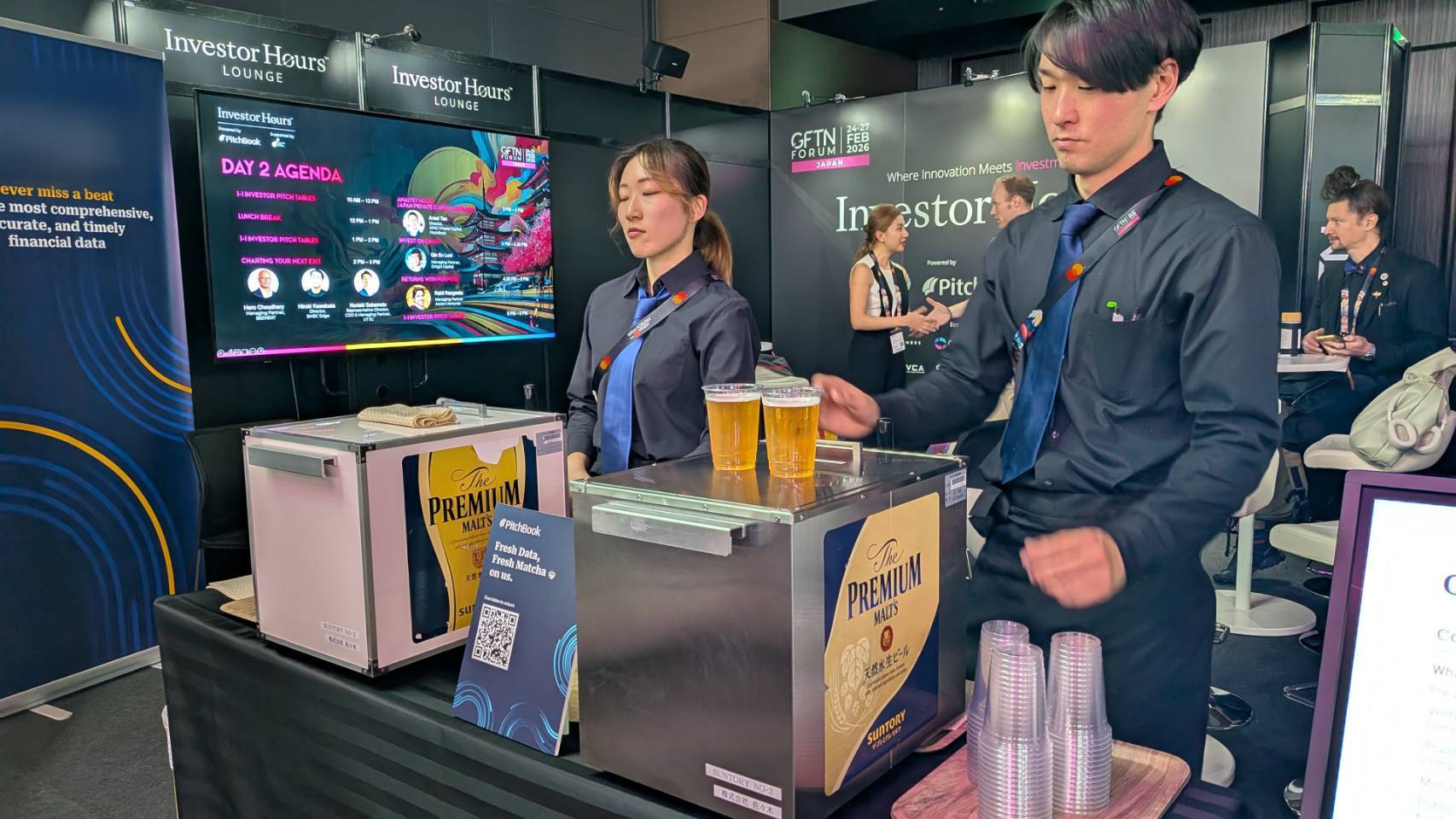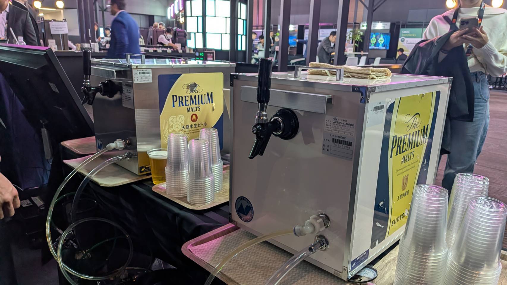 当該ブースでは、抹茶ラテ約70杯、ビール約150杯を提供しており、来場者の動きに応じた柔軟な対応が求められる現場でした。